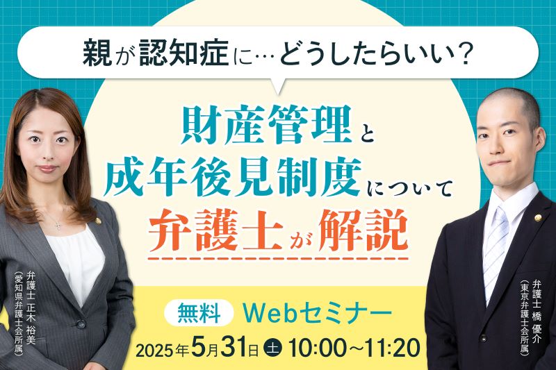 アディーレ法律事務所は、親の認知症に関する不安を抱える方へ向け、財産管理と成年後見制度について弁護士が解説するWebセミナーを5月31日(土)に開催します。